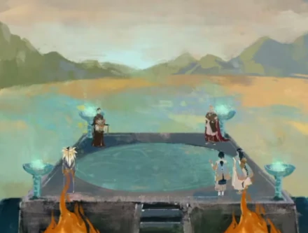 前进到祭坛,将弓箭拖到火堆,把空中右侧物品放右下角碗,左侧放右上角,上方放左上角,下方放左下角。点亮四角后,把蝴蝶拖到阴阳脸角色头上。
