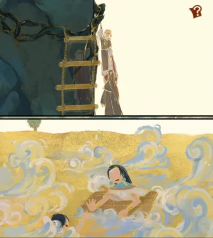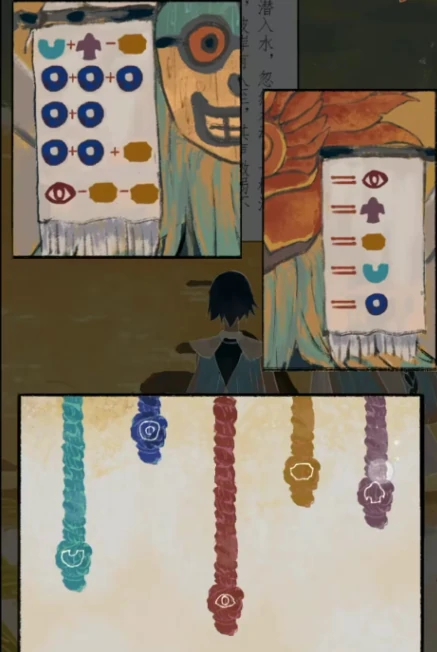 玩吐泡泡抓鱼小游戏,泡泡别碰其他鱼,难的话建议跳过。完成后把姐姐面具拖到弟弟脸,鱼鳞拖到鲤鱼,地上玉石拖到弟弟手,玉石碎裂赤乌现身,第四章结束。
