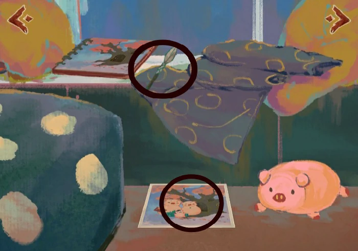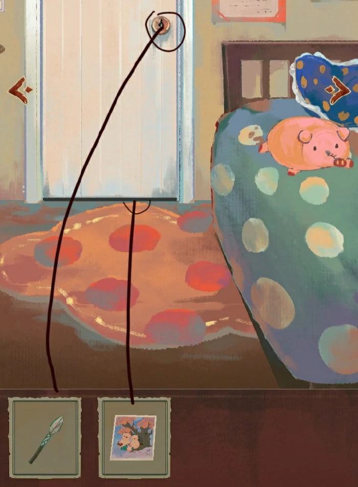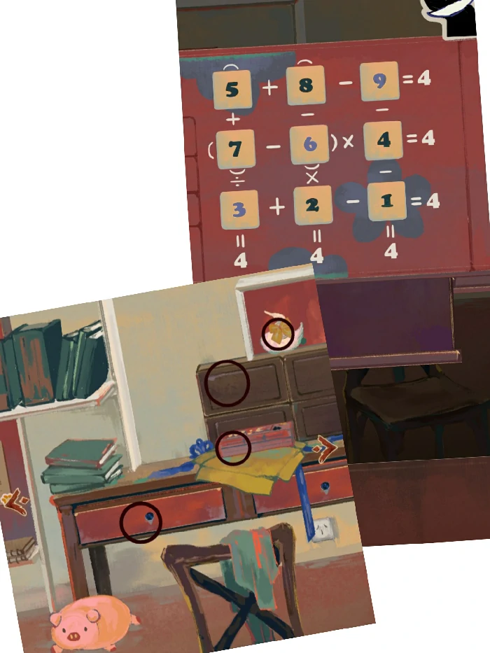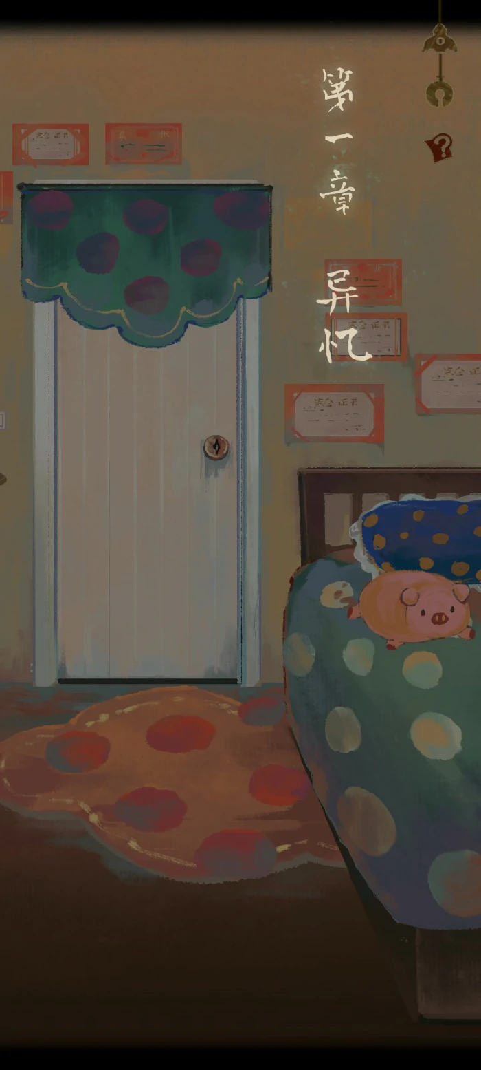 到章节初始场景,点枕头和小猪摆件,拿两枚铜牌。