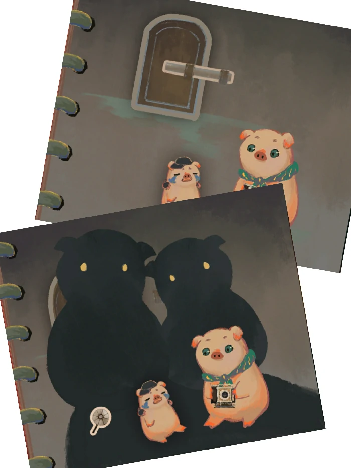 拉门栓点木门,开帽子小猪旁箱子,取圆盘状道具,装相机,拍合照。