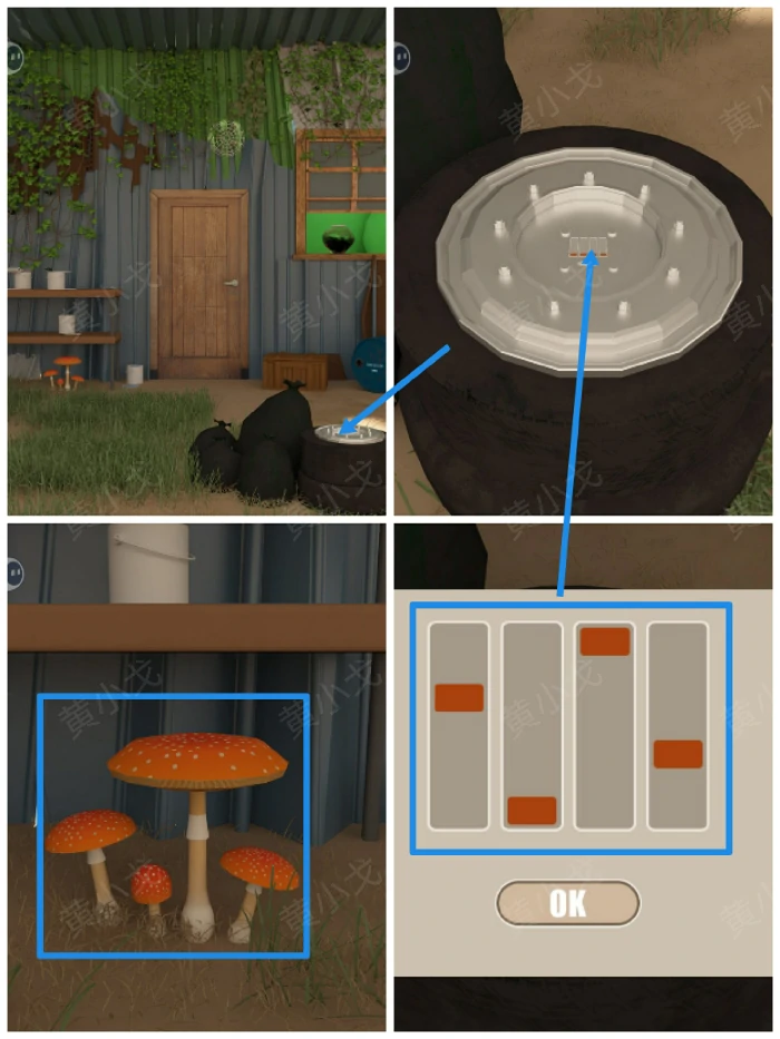 本次带来Escape Room:Secret Base游戏攻略第一部分,目标是找时光胶囊。先观察地面蘑菇,按高度顺序得线索“3142”。