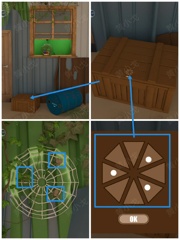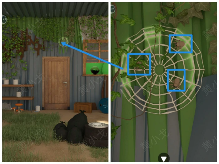 查看墙壁蜘蛛网,留意蜘蛛位置留作解谜线索。