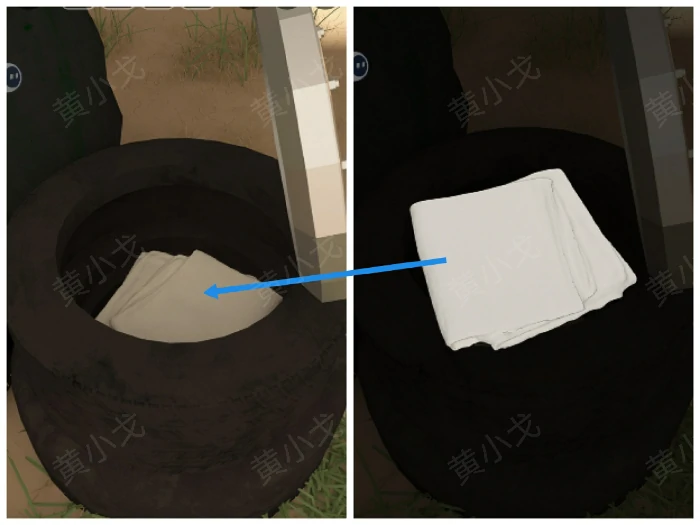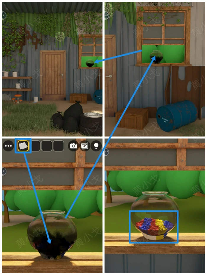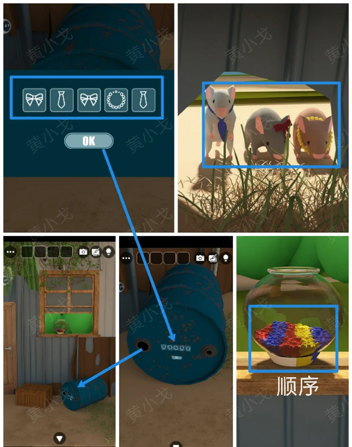 结合玻璃瓶颜色顺序和老鼠佩戴物品线索,将铁桶密码锁调整为“蝴蝶结、领带、蝴蝶结、项链、领带”。
