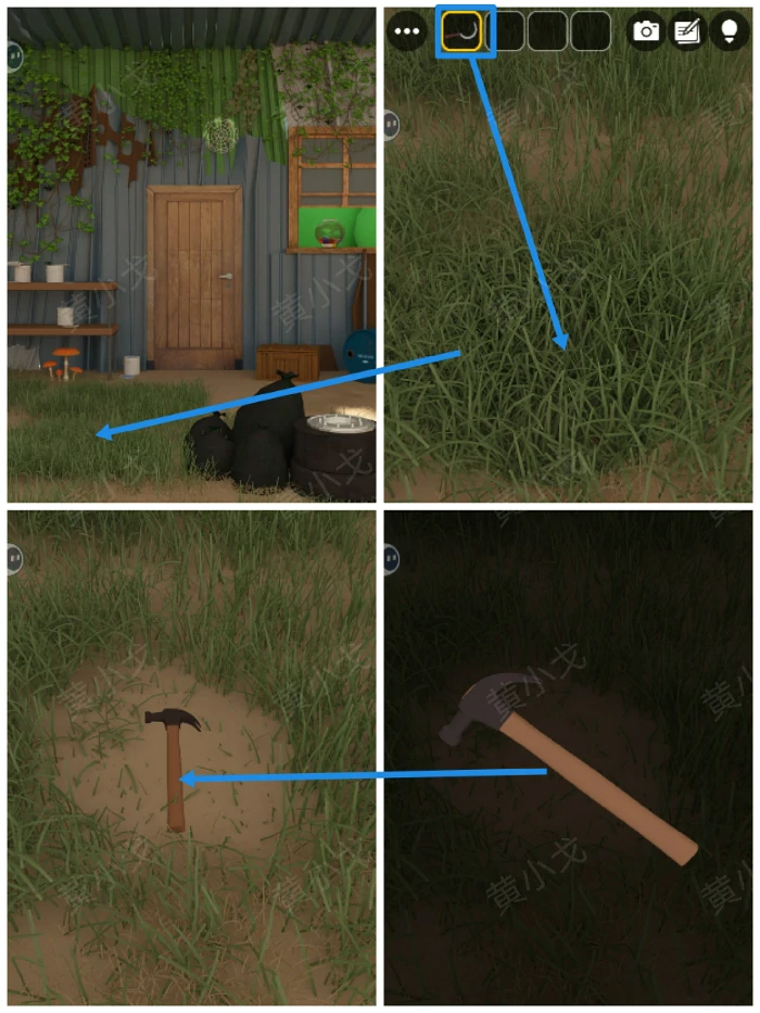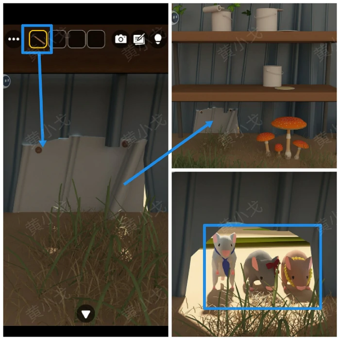 用锤子起出架子下方修补钢板上的钉子,移开钢板,注意老鼠脖子物品及颜色:紫色领带、红色蝴蝶结、黄色项链。