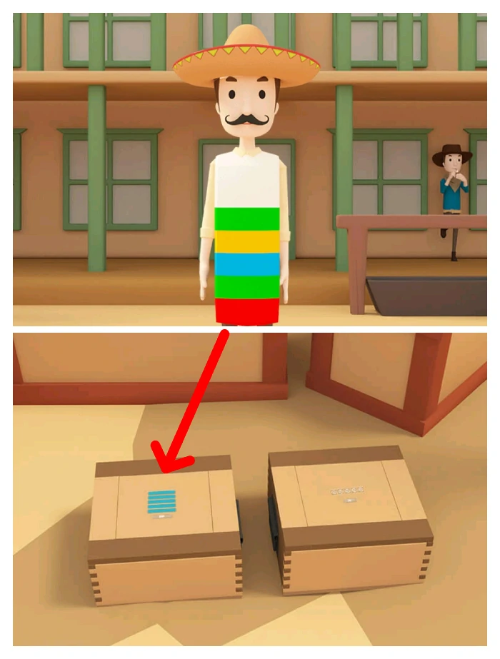 观察第一场景墨西哥人衣服颜色顺序,推算第四场景矿工左侧箱子密码“绿黄蓝绿红”,打开箱子拿手枪。
