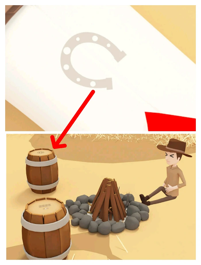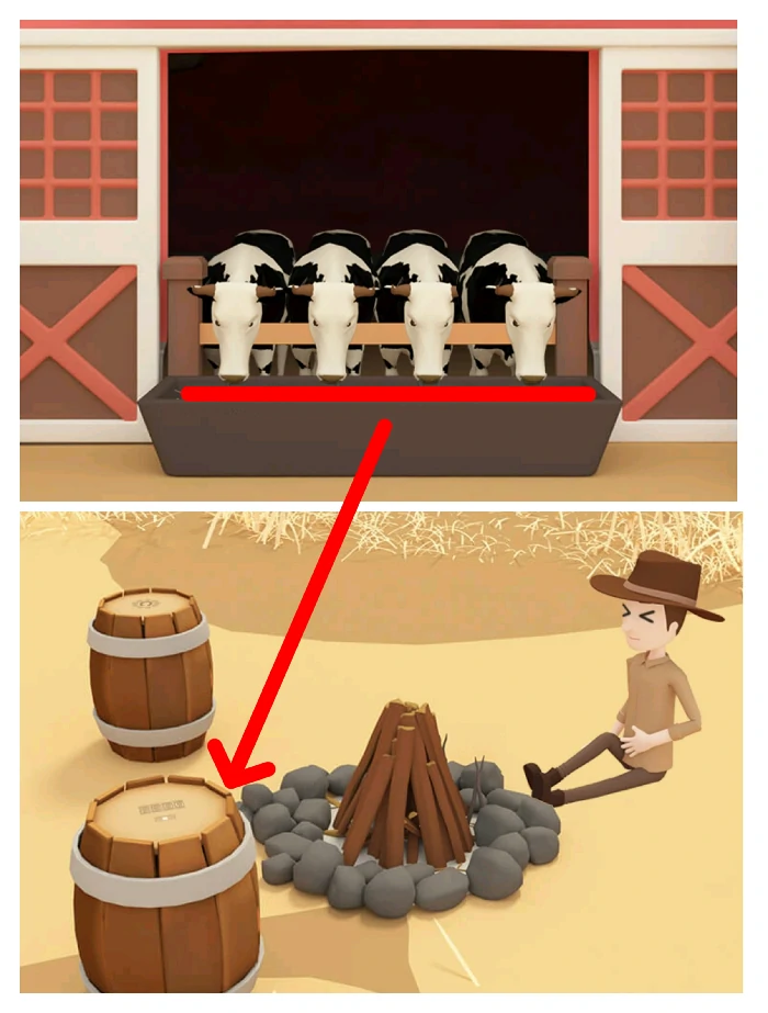 把干草放入第二场景长食槽,等牛群走出,看每头牛鼻环开口方向,解出第三场景篝火附近左下角木桶密码,打开木桶获引爆器。