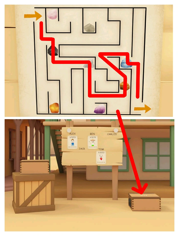 研究第四场景矿藏地图,按迷宫路径经过矿石颜色,推断第一场景通缉令右侧箱子密码“黑白黄蓝”,打开箱子拿干草。