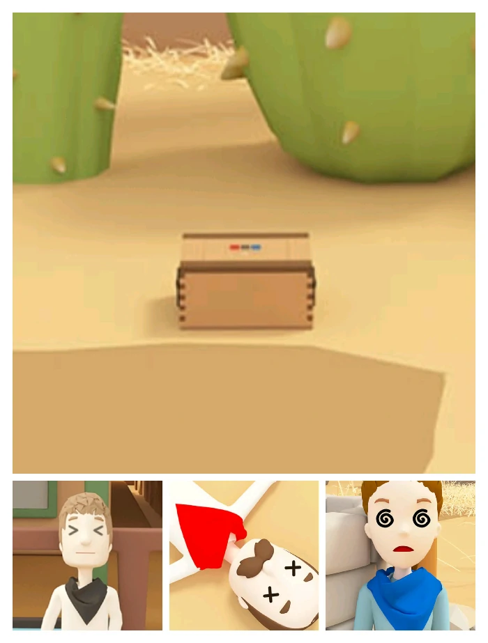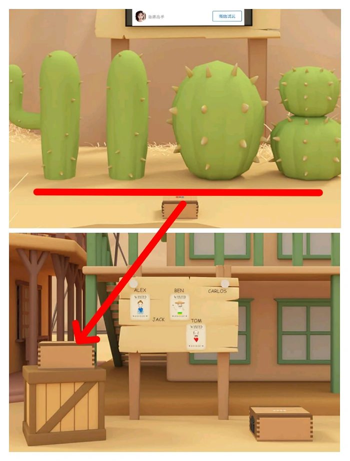 结合三位晕倒人物领巾颜色和表情,打开第三场景仙人掌前方箱子,拿通缉令B。
