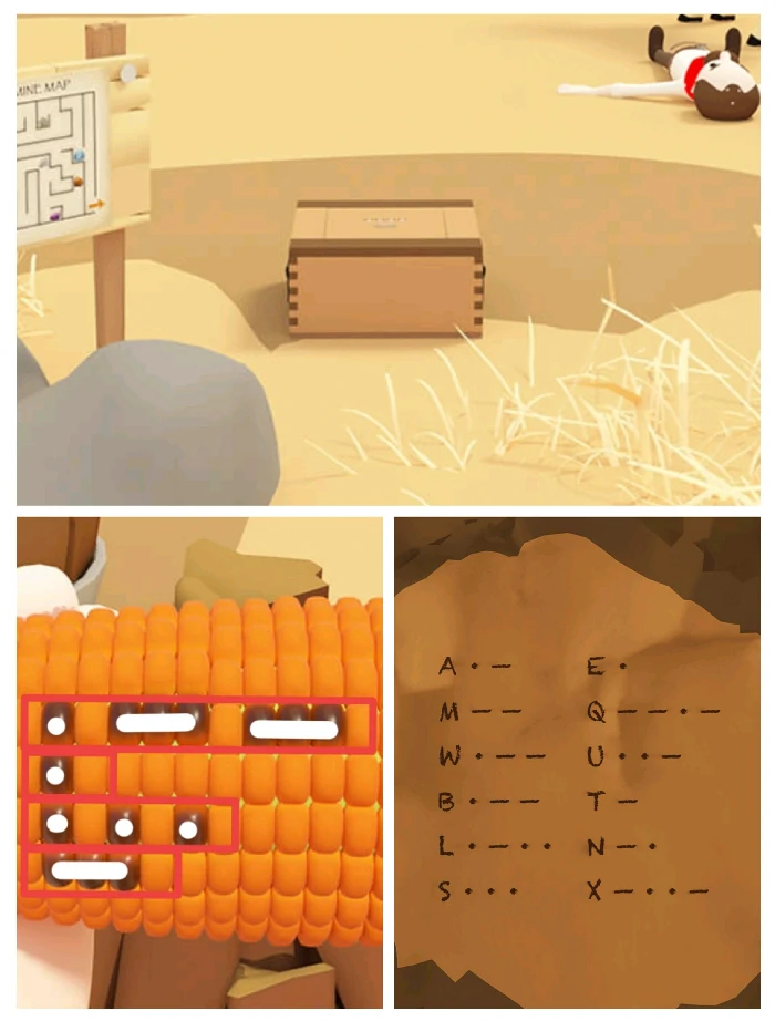 把玉米交给第三场景篝火旁人物,烤制后获取摩斯电码,对照第四场景矿洞内右侧墙电码表,解读矿藏图旁箱子密码“WEST”,打开箱子拿酒瓶。