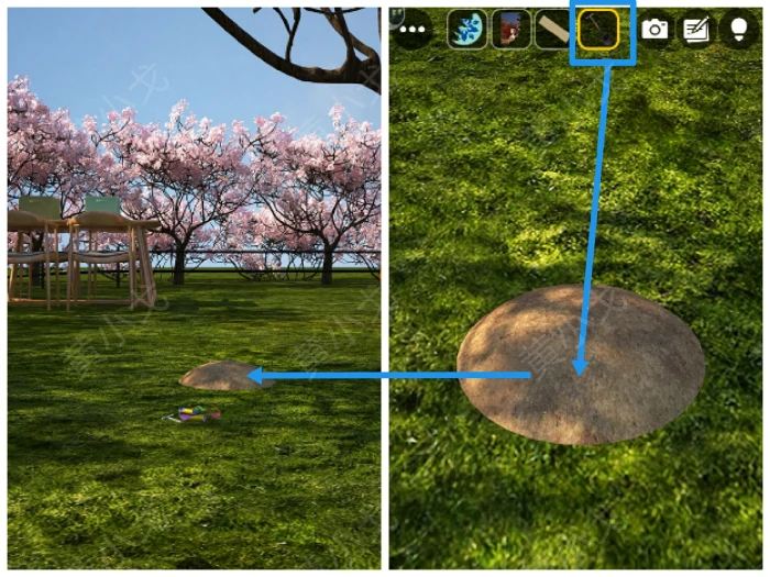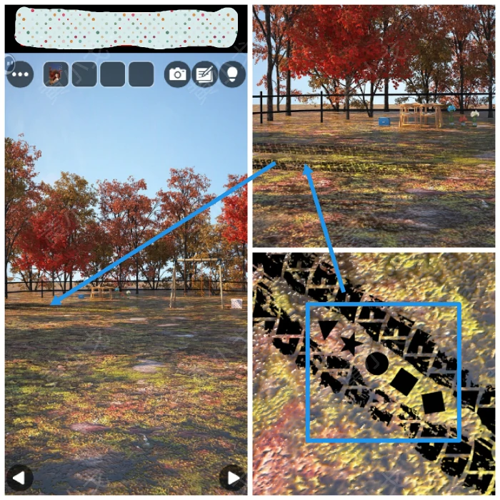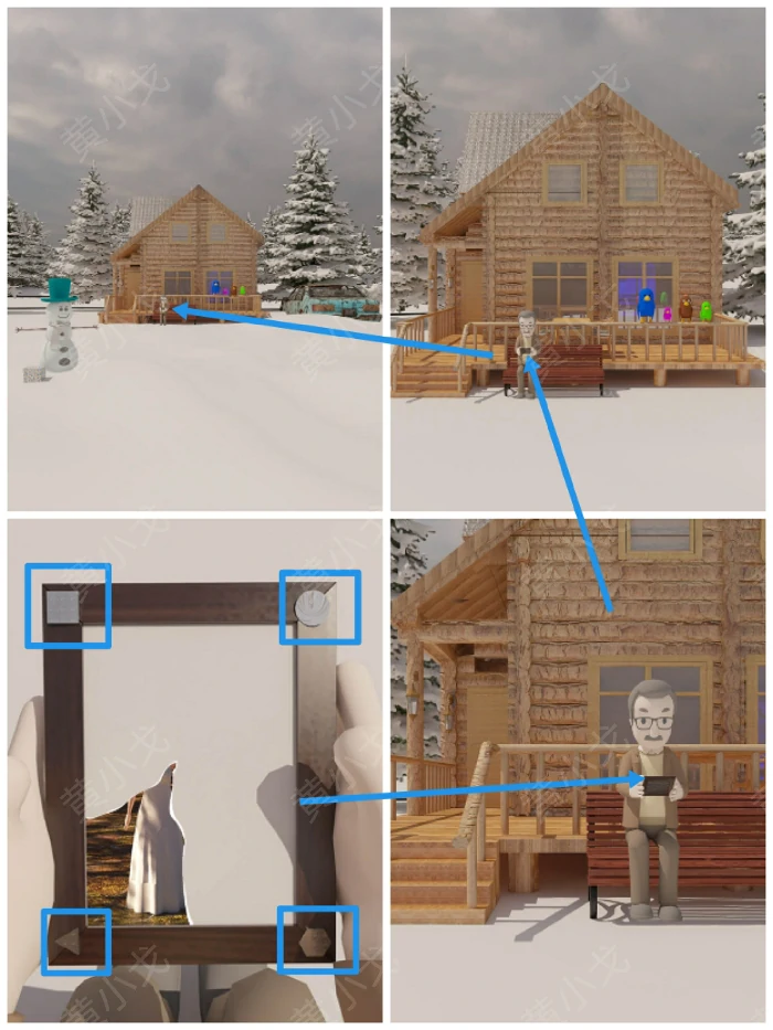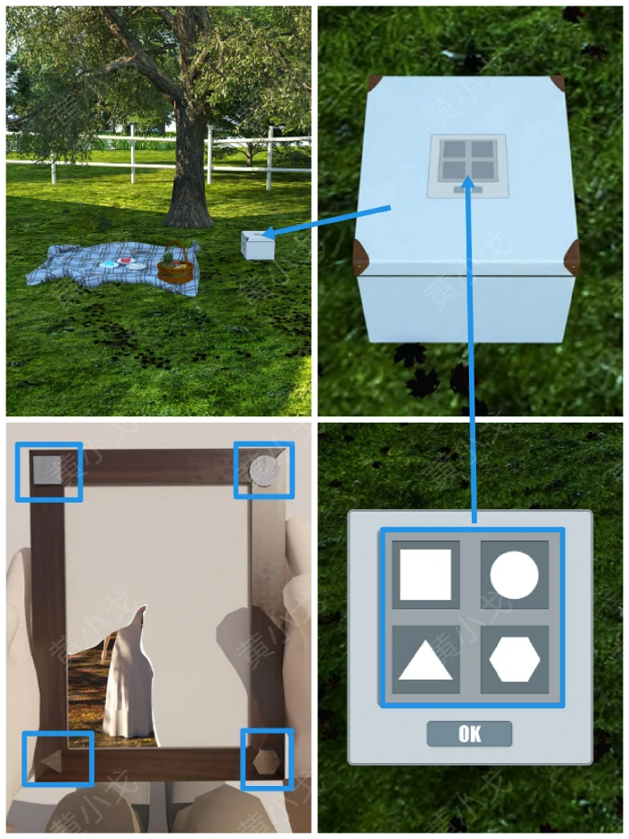 18. 找树下箱子,按老人相框图形位置调密码锁:左上正方、右上圆、左下三角、右下六边