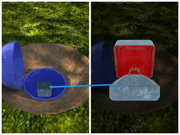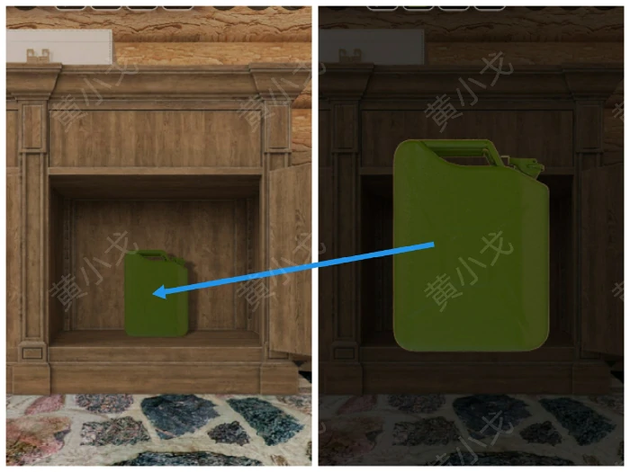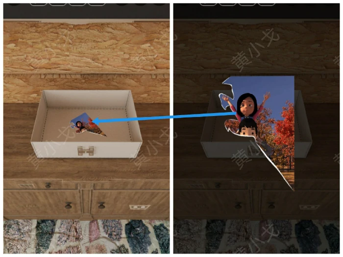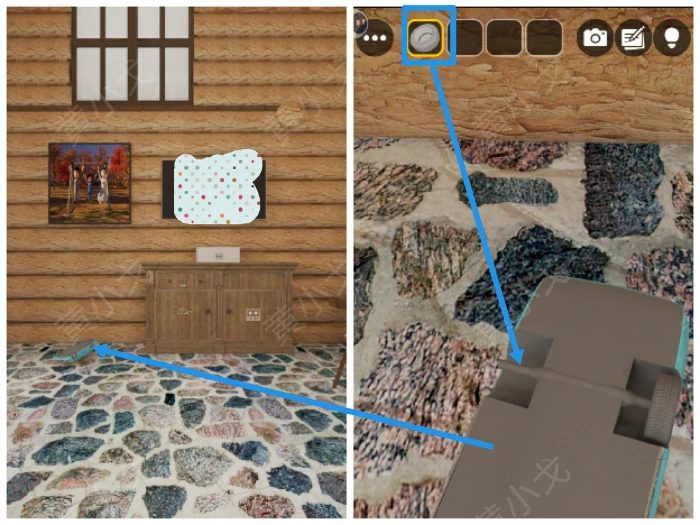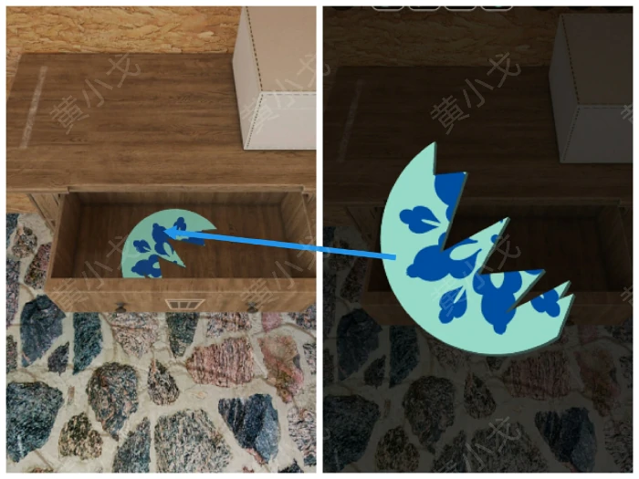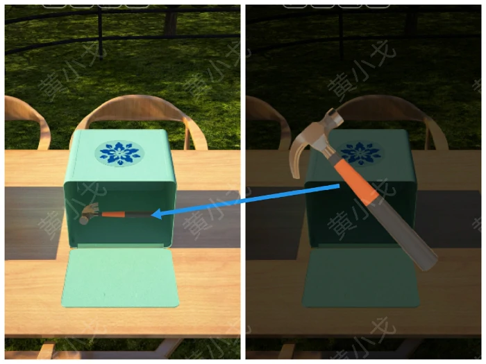 8. 找桌子右侧盒子,放两块拼图碎片进凹槽