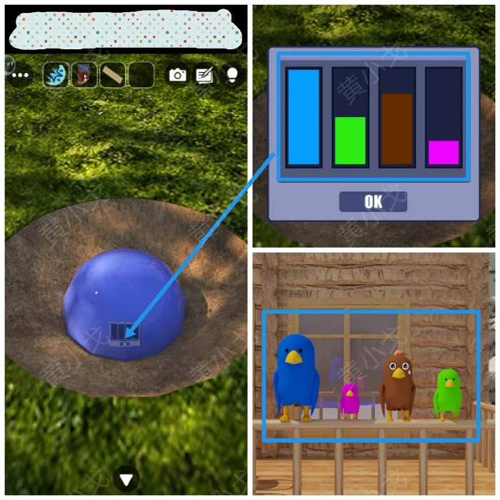 2. 时光胶囊出现,按冬季场景鸟颜色和高度调密码锁:蓝4、粉1、棕3、绿2