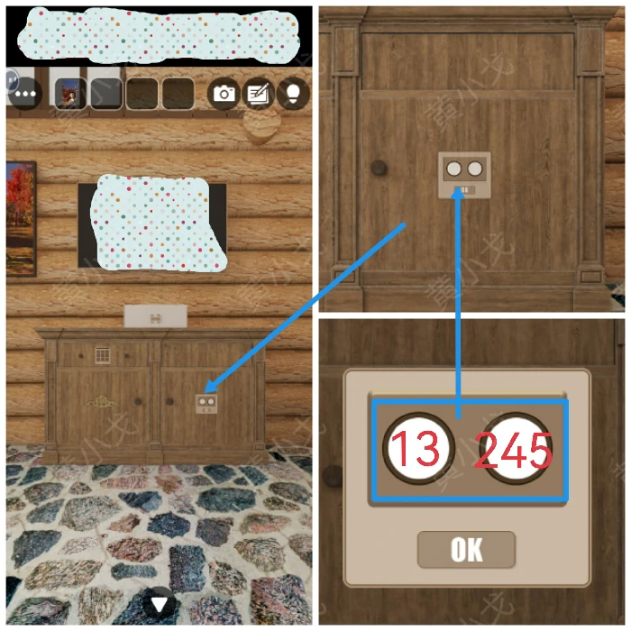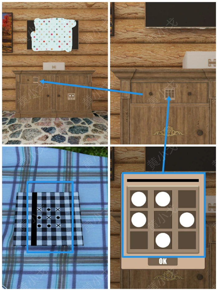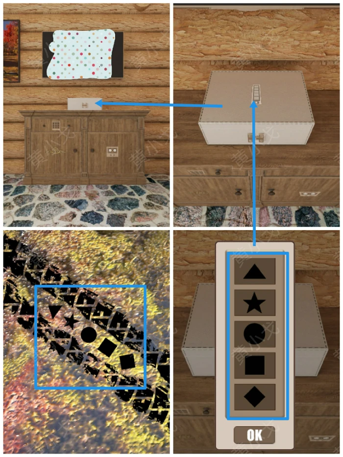 6. 进木屋,按野餐垫图案调柜子左侧抽屉密码锁