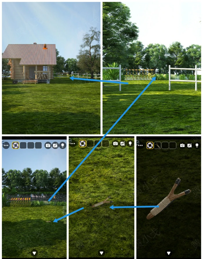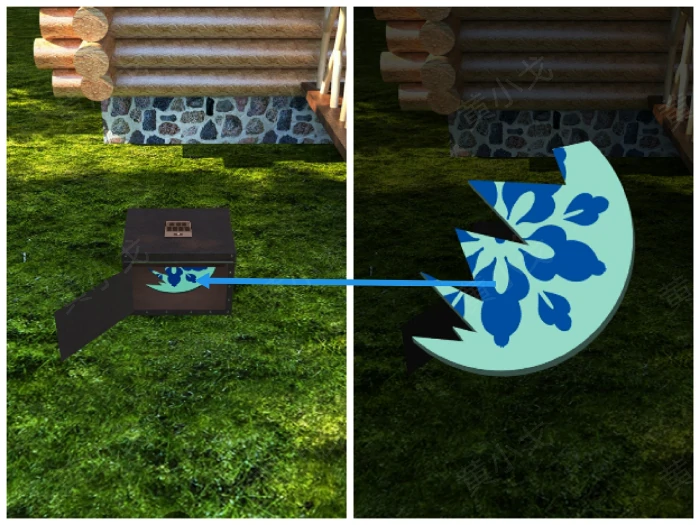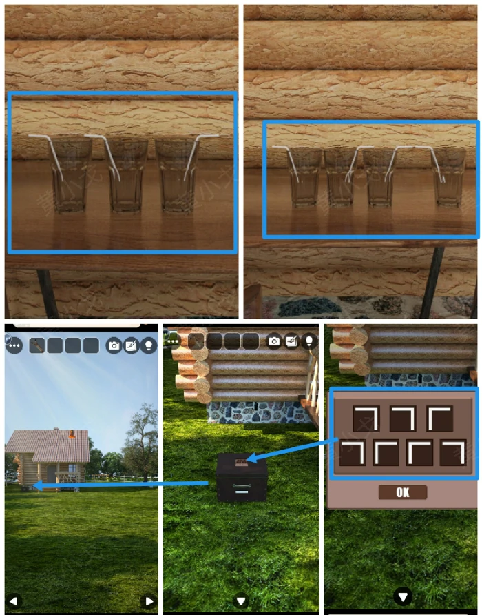 14.回到屋外,找到木屋前箱子,按杯中吸管方向提示调密码锁:上层左左右,下层左右右左