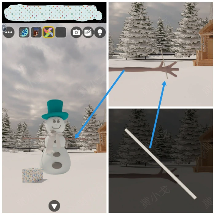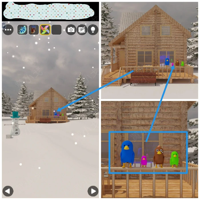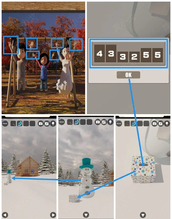 18.转到雪地场景,找到雪人旁盒子,按全家福中人们手势输密码433255