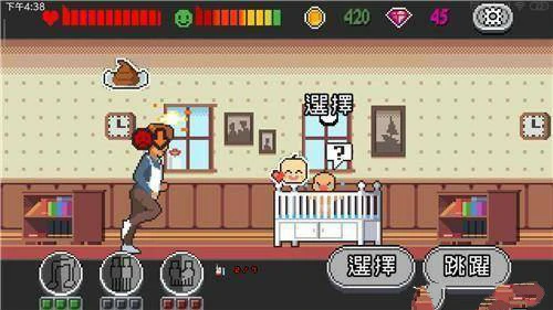 1. 游戏横版跑酷,右侧两按钮。用选择键处理事件,如培养兴趣、择偶、购置资产,决策影响结局。