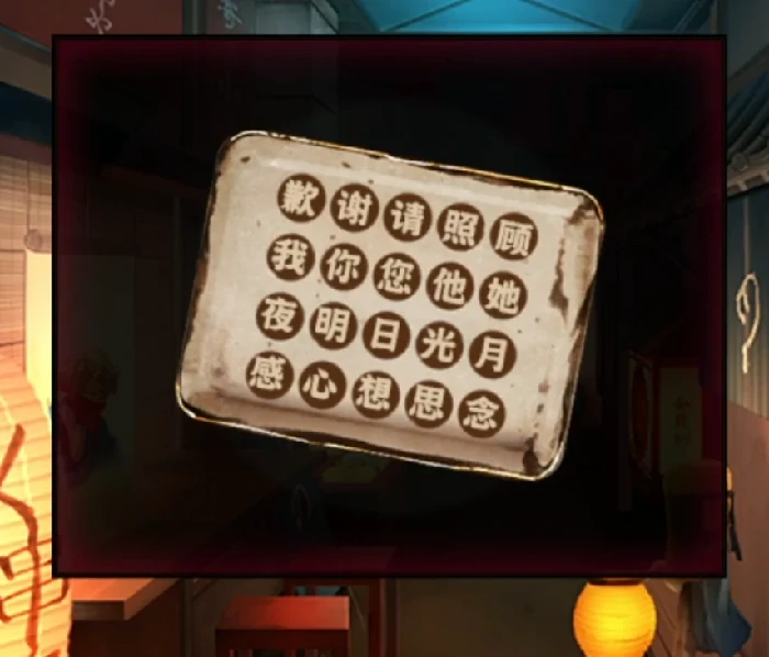 取走炉子上的扇子,对烤串用扇子看清排列。下方串序乱,洋葱圈有提示,记住对应位置:1 - 4、2 - 1、3 - 2、4 - 3、5 - 1。从烤炉后方左侧柜子拿餐盒,查看餐盒文字得:1 - 4感、2 - 1谢、3 - 2您、4 - 3光、5 - 1顾。检查右侧带密码锁柜子,调密码为“感谢您光顾”,打开柜子拿筷子。和旁边NPC对话,触发送外卖任务。