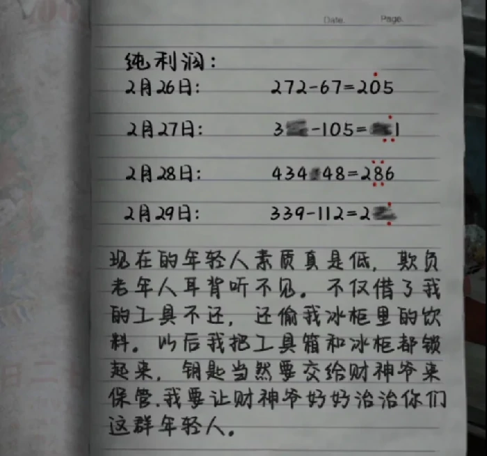 与店主对话后选购,桌上糖果暂不能拿。退回查看右侧冰柜,已上锁。点击中间偏左窗户有惊吓效果。查看窗台上笔记本,第一页补充第二页提示,第二页日历显示用水果和糖果供奉财神。注意备忘录红点,一个红点代表0,结合收入信息推出三个红点为4,四个为8,两个红点为7,记下这些数字。