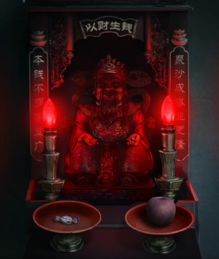 查看右侧红灯机器,放纸币取纸元宝。中间货架左上角有创可贴,暂不用。在右侧神龛盘子放糖和苹果,献上纸元宝,从财神处得钥匙。