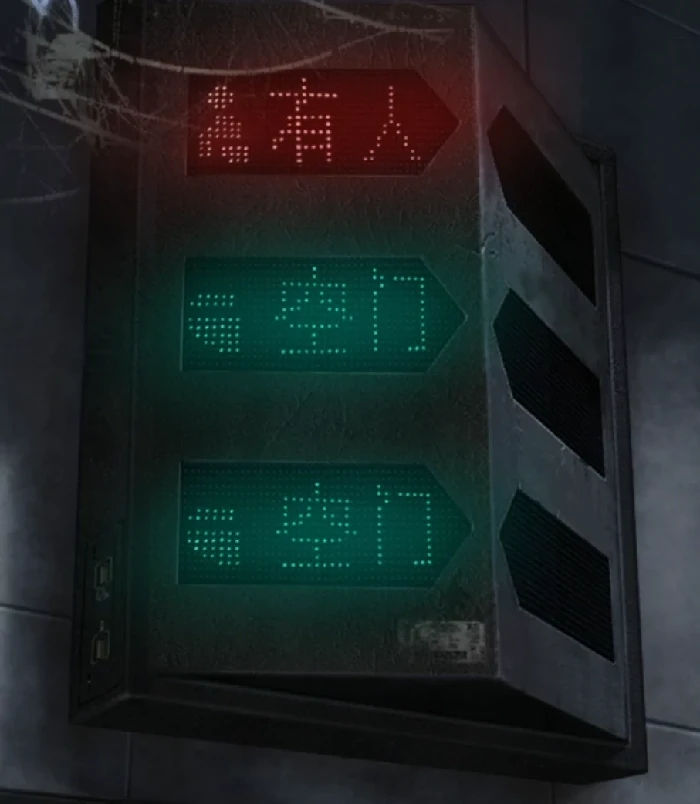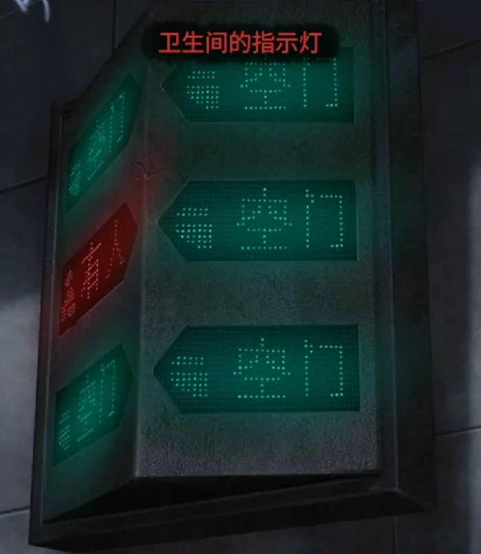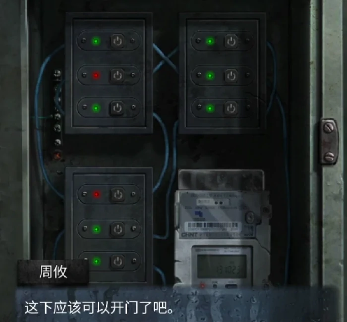 查看右边桌后墙上白色电箱,输入密码4936打开。箱内按键联动,第一行调为左中红其余绿代表女厕,第二行调为第一行红其余绿代表男厕。完成后回男厕,水管破裂,找工具处理。