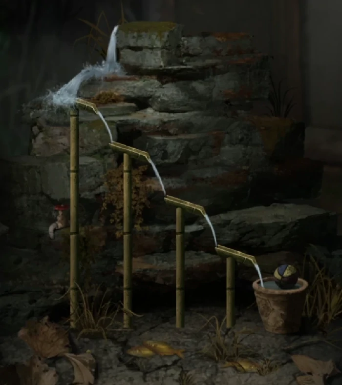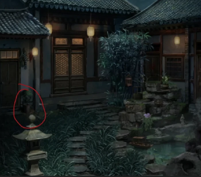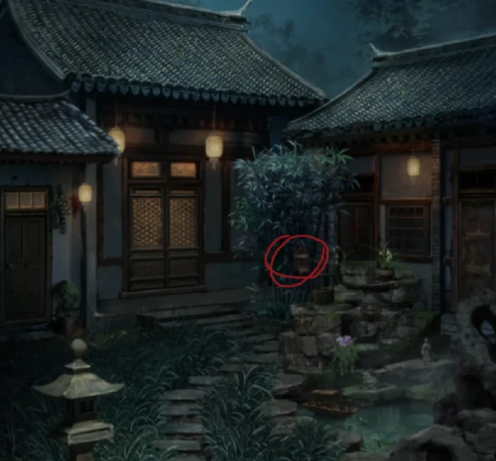 回院子,把蜡烛放左下角石灯,用火柴点燃。调右侧水池旁竹子高度,从最右侧花盆拿皮球,注意地面金色金鱼。