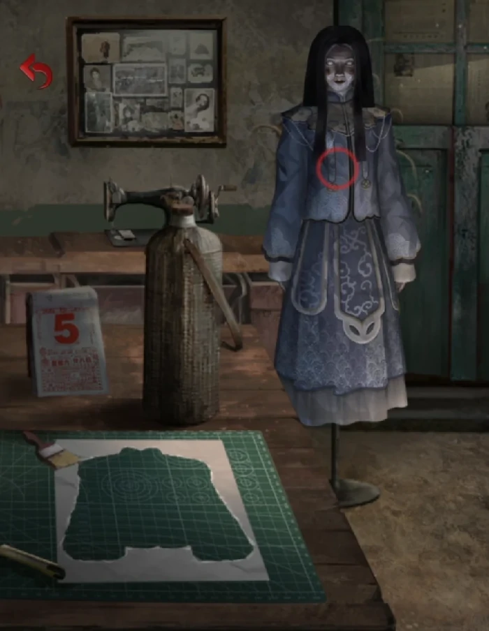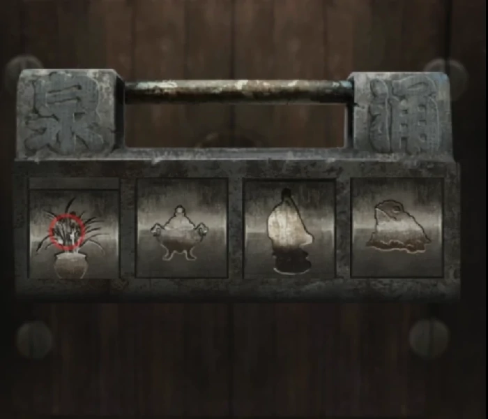 进工作室查右上角柜子,不能互动就换场景。柜上密码锁提示“泉涌”,按水流顺序调符号:兰花、香炉、仕女、金蟾。打开柜门拿剪刀和纸人头(开门有惊吓)。