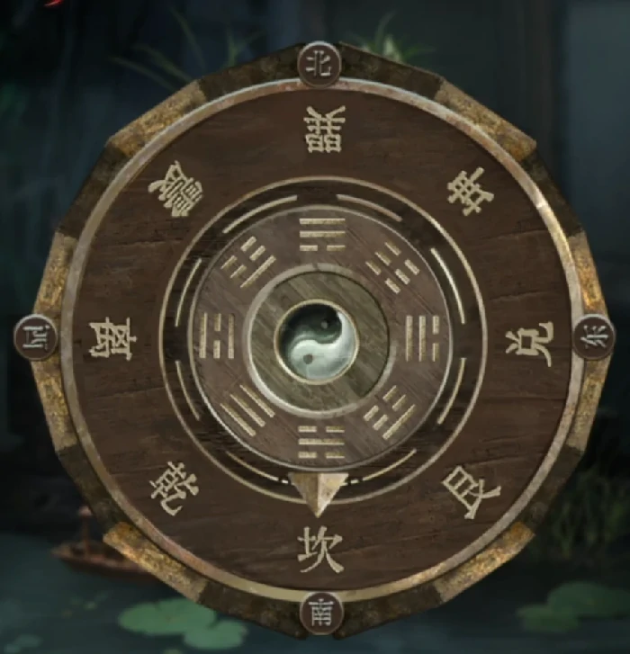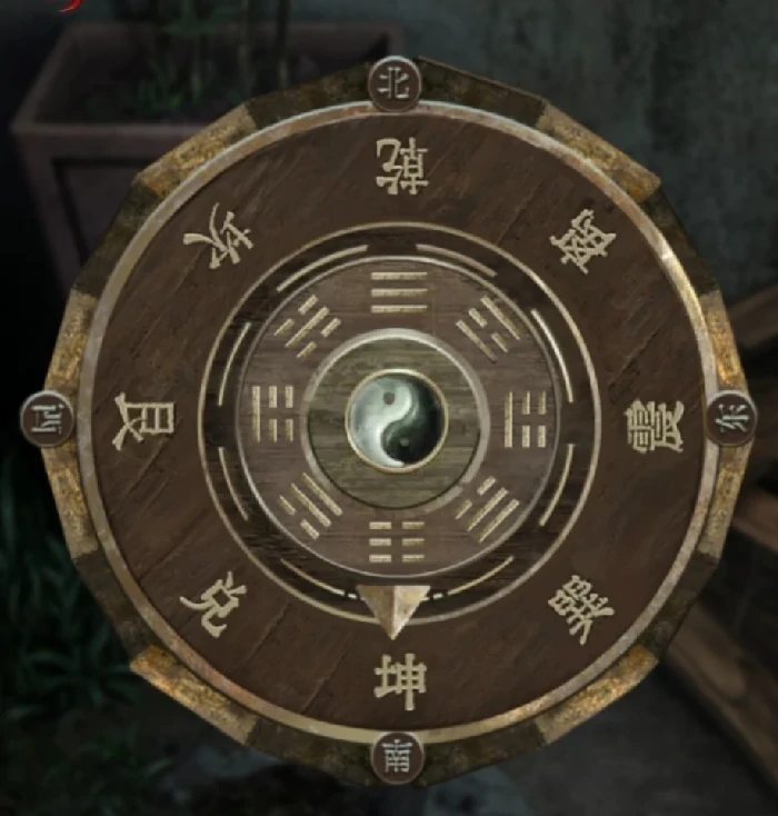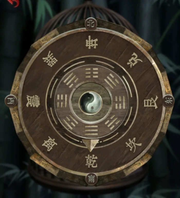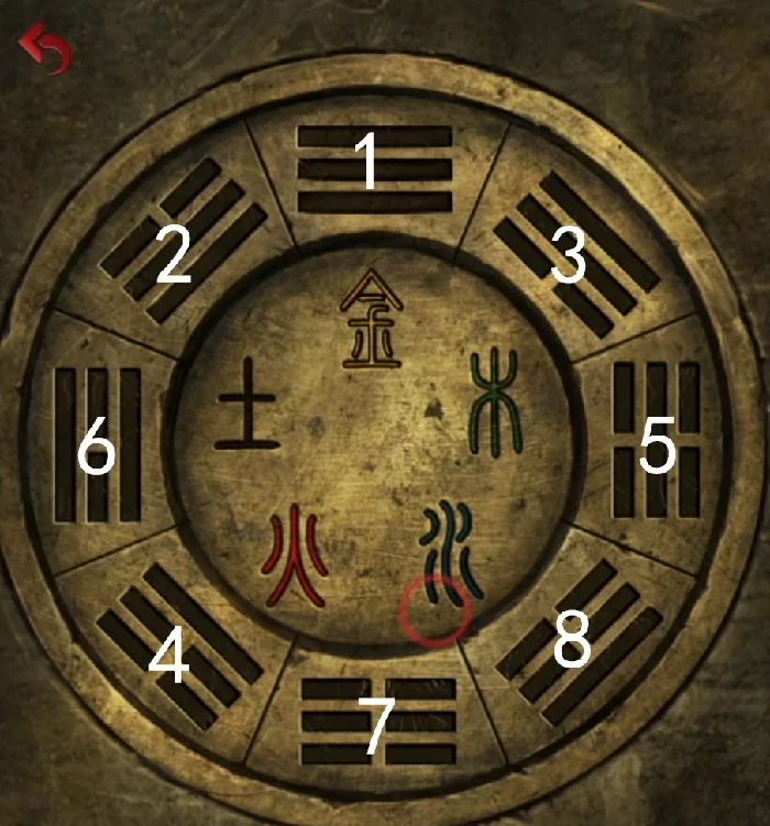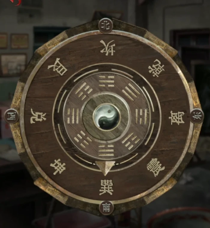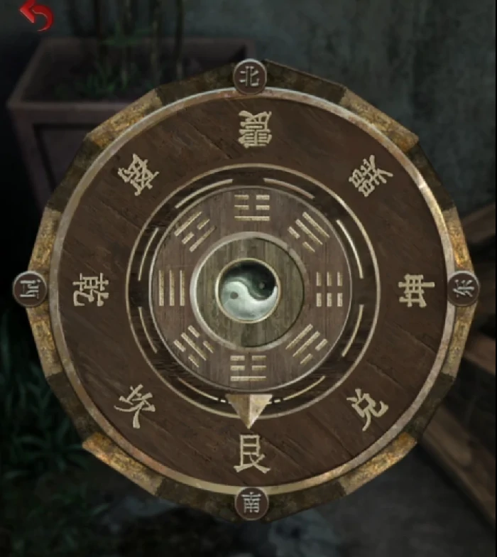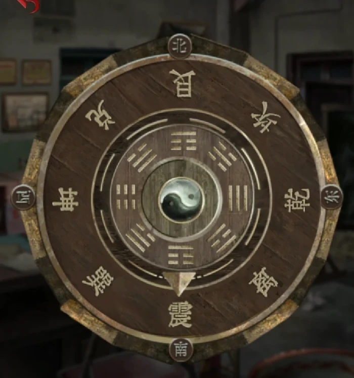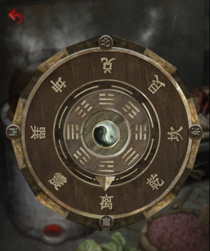 主屋门打不开,门锁是五行八卦机关,用八卦盘解谜。在厨房火炉(火,离卦☲)、水池(水,坎卦☵)、花盆及盆土(土,坤卦☷与艮卦☶)、工作室木柜(木,巽卦☴与震卦☳)、鸟笼(金,乾卦☰与兑卦☱)用八卦盘。