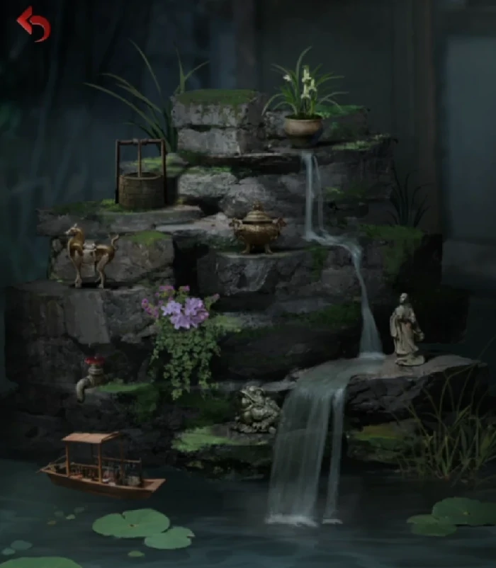 到院子水池,把阀门装在小船左上方,点开关水流。记水流经物体顺序:兰花、香炉、仕女、金蟾,这是关键线索。