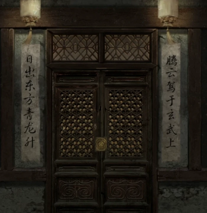 把纸人放右侧架子,触发剧情。从左边柜子拿蜡烛,主屋门再关。看门上对联,提示青龙在东,玄武在下。