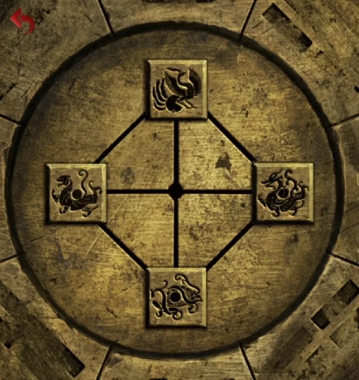 结合线索:西白虎、东青龙、北朱雀、南玄武,调主屋门锁为上朱雀、下玄武、左白虎、右青龙,开门见孩童,给皮球换钥匙。