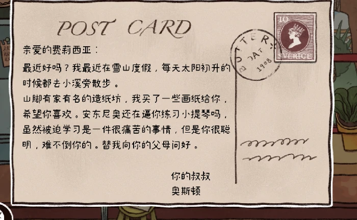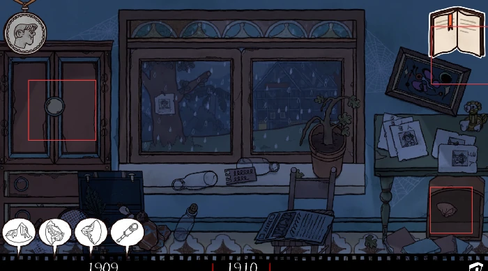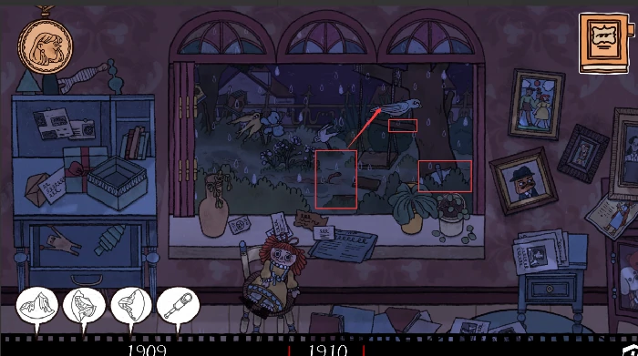 在G09年查看日记,留意变化。点桌上信纸,结合G08年明信片信息填书信,解锁“10年”场景。