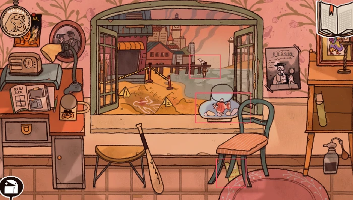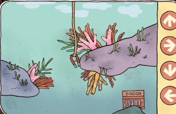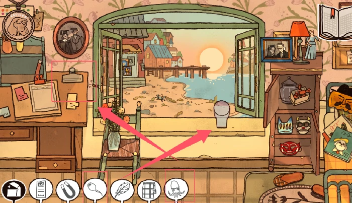 开始本章,先查最新日记内容,接着收集场景里的坐标棋子、糖果和兑换票。然后点击吸铁石,完成螃蟹小游戏拿磁石。