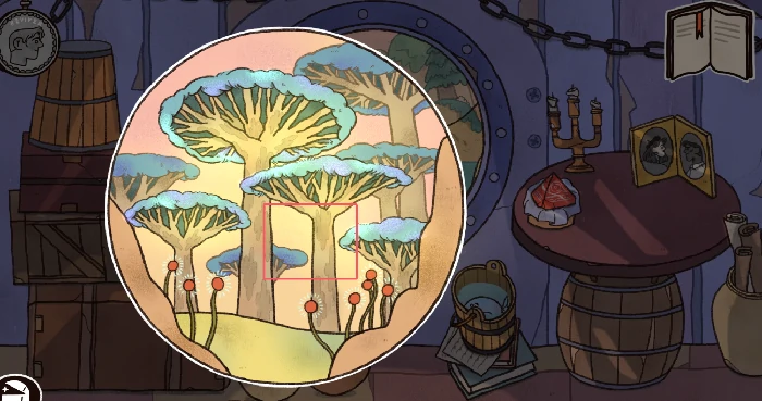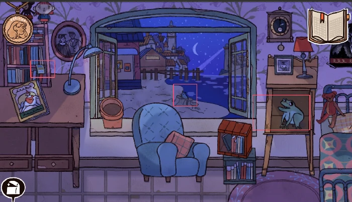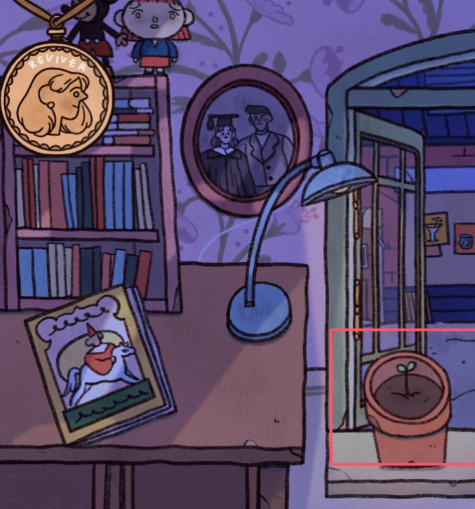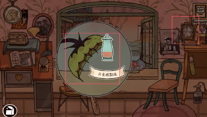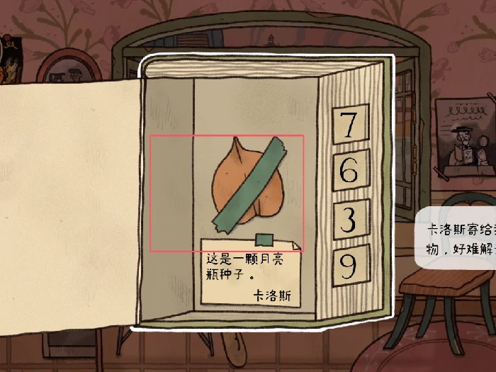 解锁书本密码,结合另一场景钟表提示,看便条,根据时针分针位置,输7639拿月亮瓶种子。