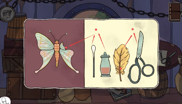 进新场景,捡兑换券。点鱼缸拿发条,放磁石到窗台绳子处,完成小游戏拿水下箱子。开箱子完成小游戏,拿半边钥匙和犯罪照片。箱子解法是先调按钮到最下,再调橙、黄、蓝颜色位置。