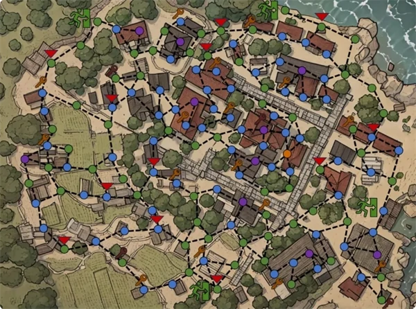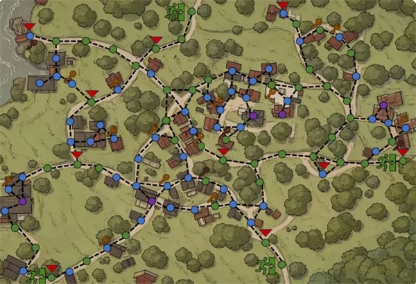 村庄路线图,三角形是玩家和AI复活区