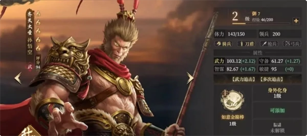 孙悟空是追击型核心输出。用普攻触发追击,靠队友辅助打高额伤害。自带术法身外化身,普攻后概率造成武力伤害(满级120%),小概率对周围额外造成60%武力伤害。该技能有范围输出能力,6级地后开荒表现好。