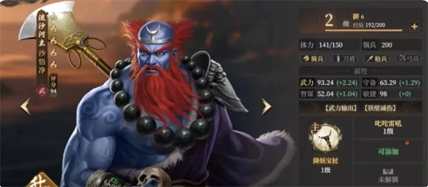 沙悟净二速,用叱咤雷吼保障生存,其他技能补伤害、加负面状态。选以武破巧与攻城掠地追求高输出,也可用飞身托迹削弱敌防御。初期没金色术法,用乘胜追击或裂甲劈革暂替。