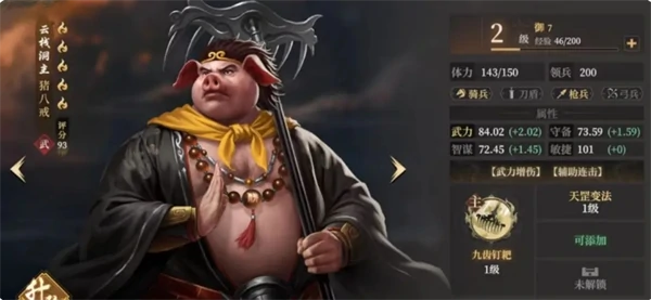 猪八戒是追击队伍辅助。增强孙悟空等队员输出。自带术法天罡变法,提供武力增伤(满级8%),概率赋予全队连击状态(满级50%),提高进攻频率。