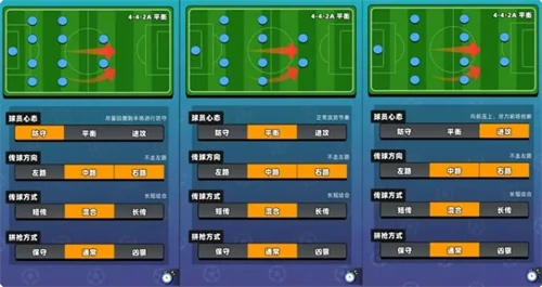 战术调整界面:战术要和阵型搭配。可调整球员心态、传球倾向、传球方式、拼抢强度。根据比赛局势灵活调整,提高胜率。当前版本直传选项未开放,为后续内容预留,简化玩法是设计理念。
