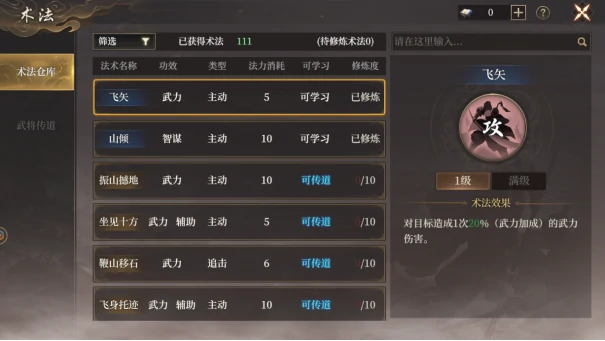 查看持有的武将主要术法,“可学习”术法,进武将详情页,点已解锁次要术法栏位学习装备。