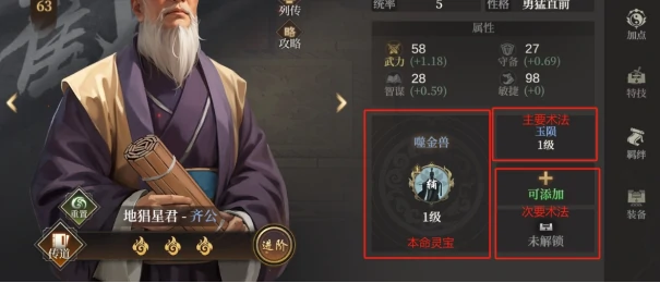 所有武将都有本命灵宝、一项主要术法和两个次要术法栏位。