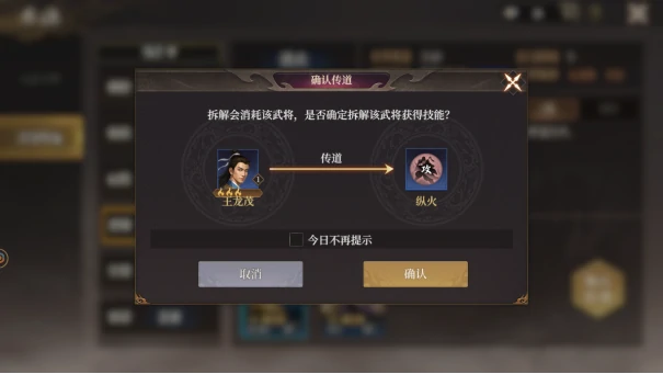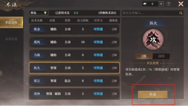 “可传道”术法,消耗1名以该术法为主要术法的武将,传道后解锁给其他武将用。