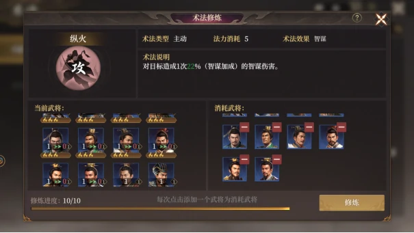 传道获得的术法需修炼升级,每次修炼消耗数名同品质武将,武将等级越高,修炼进度越多,进度达10修炼成功。
