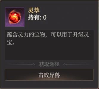 本命灵宝升级消耗“灵萃”,击败不同等级异兽获取。