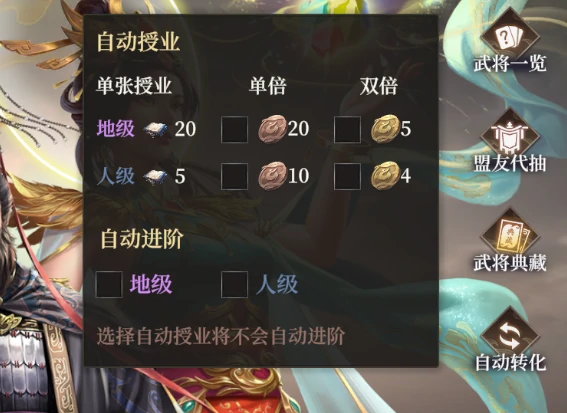 招募武将时,开启右侧自动转化功能,自动转化重复或低品质武将为术法经验。
