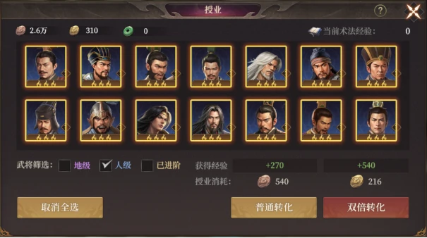 进术法仓库,点右上角“+”进武将授业界面,消耗金贝或铜贝,将重复或低品质武将转化为术法经验。