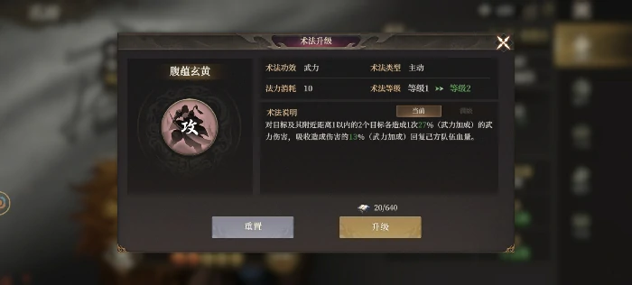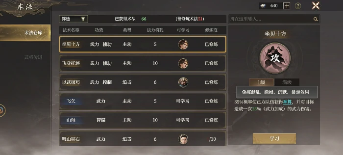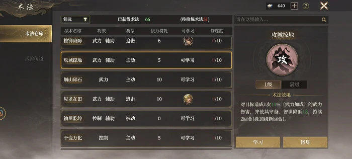 术法搭配有两种流派:一是免疫破甲流,用“坐见十方”和“飞身拖迹”,前者概率免疫多种负面状态,后者降低敌方守备与武力,都受武力加成;二是流血破甲流,选“椎锋陷陈”和“攻城掠地”,强化输出与破甲,叠加流血伤害效果好。