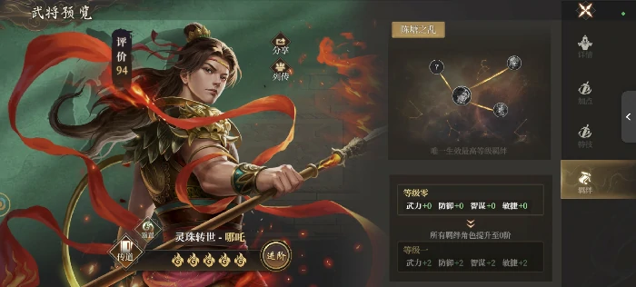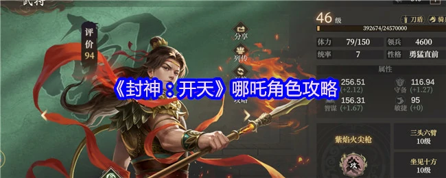 本次解析封神开天中哪吒玩法。哪吒是橙色武将,擅刀盾与骑兵兵种。其核心优势是武力成长出色,自带术法“三头六臂”和灵宝“紫焰火尖枪”伤害都与武力属性挂钩,所以要全加武力,发挥输出潜力。