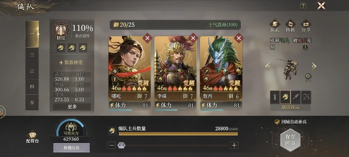 其二,开荒终极阵容:选哪吒、敖丙、李靖。此组合激活二级羁绊,属性提升大。李靖玲珑塔提供治疗与减伤,敖丙技能概率连击配合哪吒流血,压制力强。三人均全武力加点。