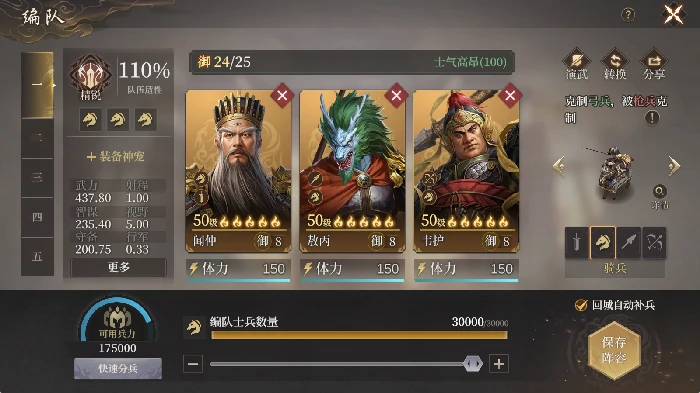 提升武将等级增加带兵数量,城主府达到9级建造演武所提升兵力上限。